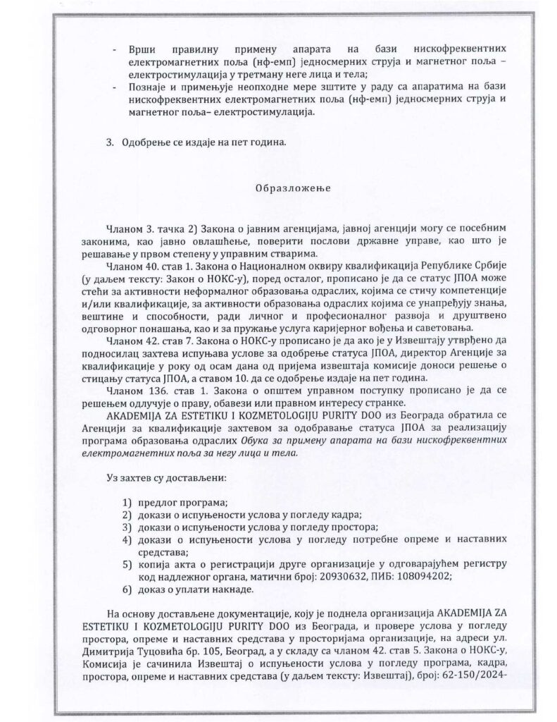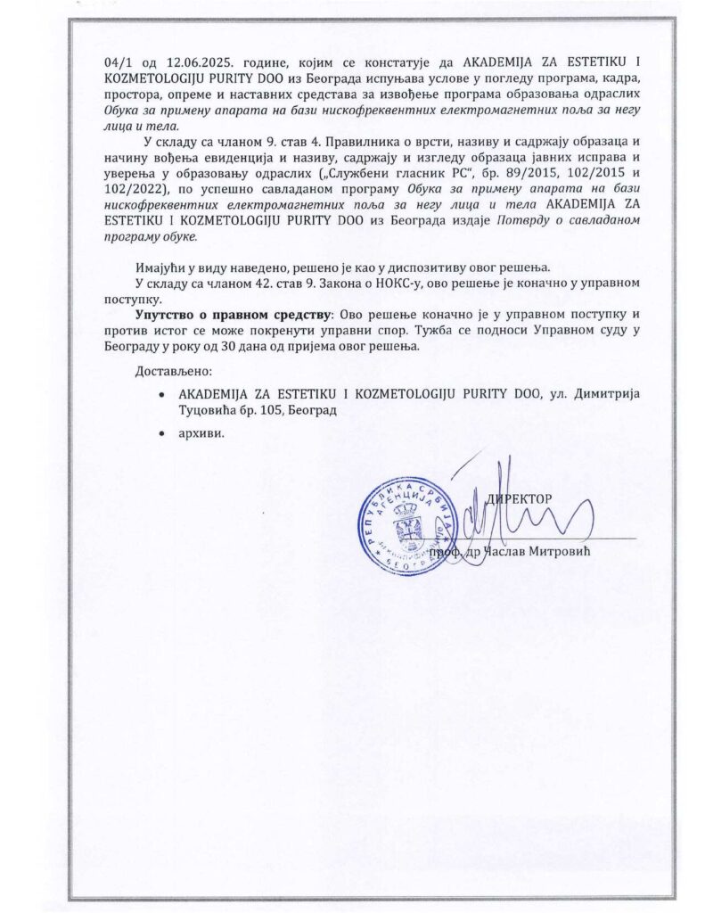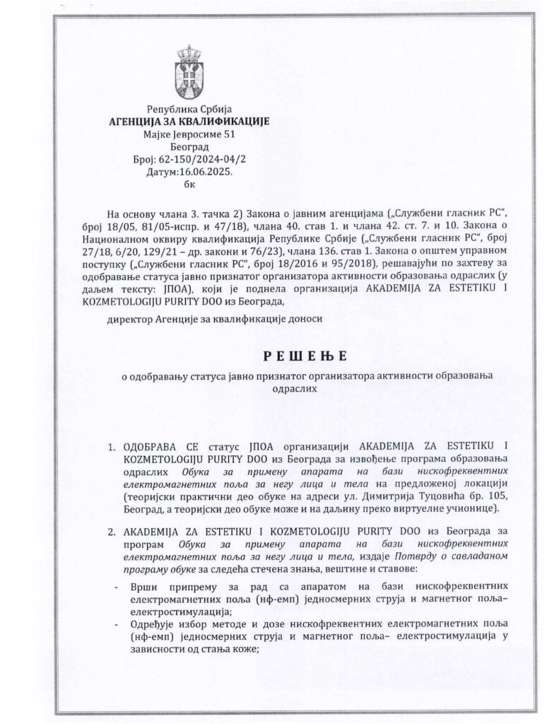Obuka za primenu aparata na bazi niskofrekventnih elektromagnetnih polja za negu lica i tela Akreditacija